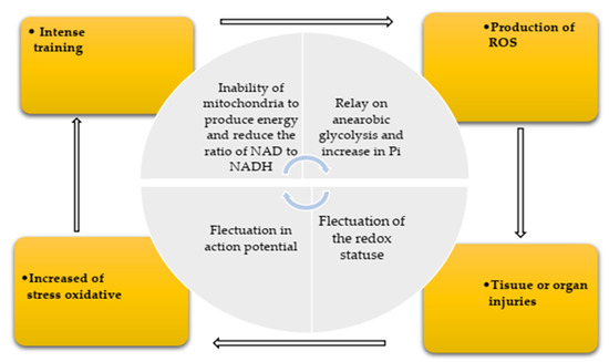 There are physiological factors that cause oxidative stress, but the effect of exercise on oxidative balance is difficult because it depends on many factors such as sex, age, and exercise status as well as intensity, duration, and frequency of exercise. Aging and exercise are commonly known as oxidative stressors [48,49]. Research has shown that metabolism, oxygen consumption, and production of active species due to intense exercise are 20 times higher than at rest [50]. Muscle contractions promotes the production of oxidants, which has importance in physiological function of the body. However, prolonged or intense exercise can lead to oxidative damage to cell compounds, and exercise-induced oxidative stress has been shown to affect muscle function [50]. Figure 2 illustrates the effect of exercise on the production of reactive active species.