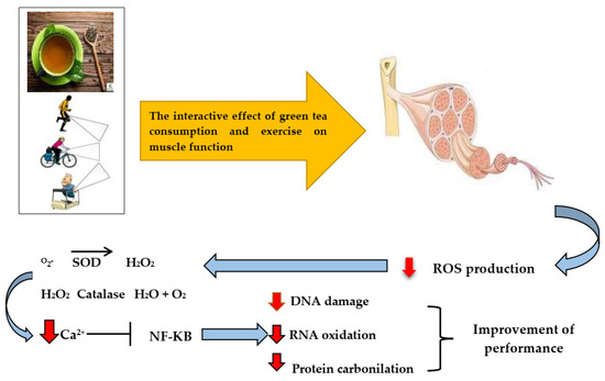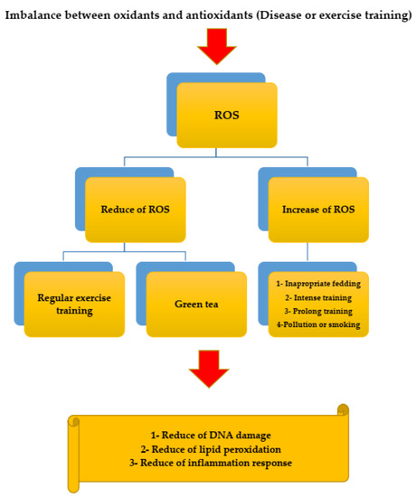 Free radicals are reactive products that have multiple effects on the human body. Endogenous and exogenous antioxidants manage the overproduction of free radicals. However, an imbalance between free radicals and antioxidant factors causes oxidative stress. Exercise and physical activity are factors that increase oxidative stress and disrupts the body’s homeostasis. Intensity and duration of training, training characteristics, and fitness level can have positive or negative effects on oxidative stress. Green tea consumption is recommended for the prevention of a variety of diseases, health maintenance, and weight loss. The effectiveness of green tea is primarily due to the presence of catechins and polyphenols, specifically (–)-epigallocatechin-3-gallate, which has antioxidant and anti-inflammatory properties based on clinical and animal studies. This review investigates the effect of green tea exercise and their interactive effects on free radicals and sports improvement.