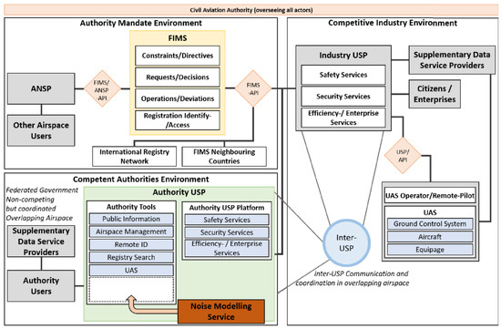 The U-space architecture for drone operations with the addition of a noise modelling service. Evolved from the Swiss definition of U-space [15].