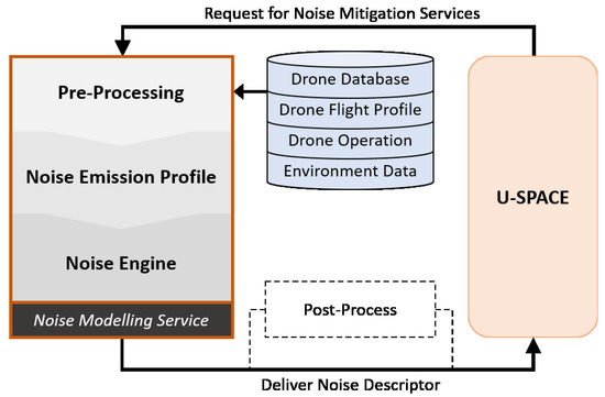 The working procedure of the proposed framework is described below. First, U-space or a UTM system sends a request to the noise modelling service for using noise mitigation services related to a particular drone in a specific setting and environment. This could be to forecast or monitor an airspace. Then the NMS assesses the petition and initiates its three main processes. The pre-processor gathers and manages the necessary data, and then delivers key parameters to the noise calculation. The data must cover the drone and the environment it operates in. The data the pre-processor needs could be from various sources. In a U-space architecture, the data would be provided from Supplementary Data Service Providers, as seen in Figure 2.