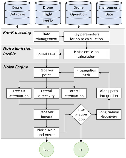 Pre-processing is a sub-process that manages and integrates the drone database, drone flight profile, drone operation, and environment data. It produces key parameters from the integrated data, which can be utilized later by other two modules i.e., the noise emission calculation profile and the noise engine. When the relevant data is unknown, one should consider the worst conditions within the drone class (e.g. maximum take-off mass). The acoustic and performance data is sourced from the drone database. The drone’s characteristics, such as operational weight, procedure and atmospheric state, are acquired and managed from the drone operation. The information of the drone in a three-dimensional space, to achieve height, speed, time and mission, is sourced from the drone flight profile. The surrounding conditions around the drone’s location, such as weather and geographical information, is collected and managed from the environment data.