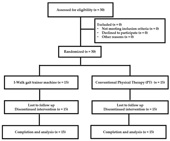 | I-Walk (n = 15) | Conventional PT (n = 15) | ||