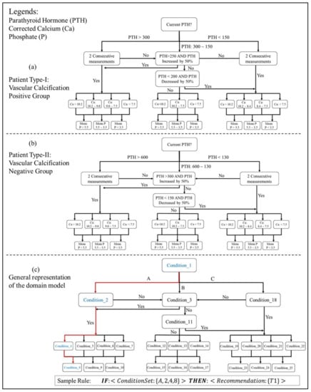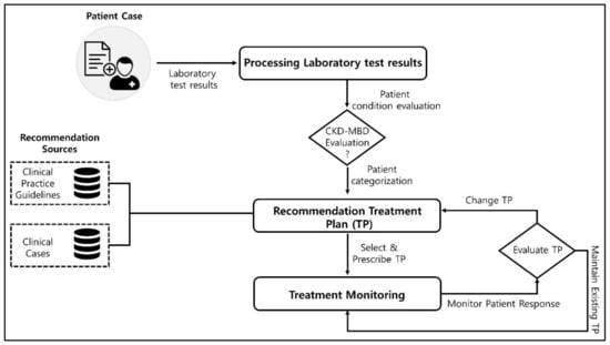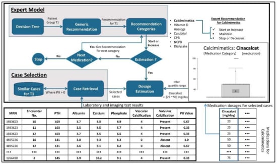 As CKD–MBD is not a single disease entity but encompasses a variety of altered mineral and bone metabolisms, a patient is initially evaluated for CKD–MBD by measuring serum calcium, phosphate, and PTH levels, and examining ectopic calcification with lateral abdominal radiography and echocardiography. Then, considering CKD–MBD status and associated clinical situations, an appropriate treatment plan consisting of dietary modification and medications is established. The objective of the proposed CKD–MBD CDSS is to assist clinicians in the selection of an appropriate treatment regimen, i.e., medication selection and dosage recommendations for the management of CKD–MBD in ESRD patients. In this regard, we have focused on the expert-in-the-loop approach, i.e., clinicians provide essential domain knowledge for decision modeling and recommendation generation.