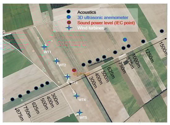 LAeq (10 min) sound levels were recorded using 15 sound level meters located on the two dominant wind directions of the site, and at distances from the wind farm ranging from 0 to 1500 m (Figure 1). This arrangement enabled sound levels to be measured for downwind and upwind situations, for which sound propagation differs [19]. The sound level meters (B&K 2250, ACOEM Solo and Cube, Rion NL62) were placed at a height of 1.5 ± 0.1 m above the ground and measured in the frequency bands [12.5 Hz; 20 kHz] or [1 Hz; 20 kHz] depending on the point. In addition to these sound level measurements, the sound level power of the wind turbines was derived according to the protocol described in the standard IEC 61400-11 [20], based on sound levels measurements made with a flush-mounted microphone on a circular reflective plate of 1 m diameter, placed on the ground 143 m from a wind turbine (Figure 1).