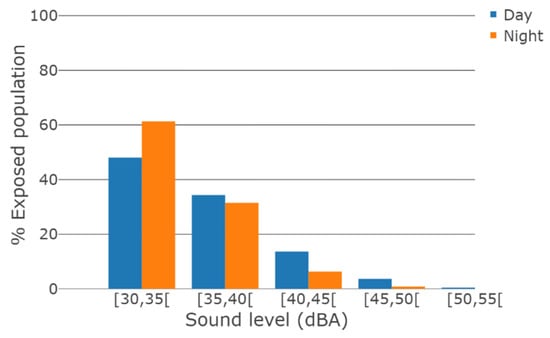 Finally, 48% and 61% of the people exposed to sound levels above 30 dBA were exposed to sound levels below 35 dBA for daytime and night-time propagation conditions respectively, and 82% and 93% of the people exposed to sound levels between 30 dBA and 40 dBA for both daytime and night-time propagation conditions respectively (Figure 5).