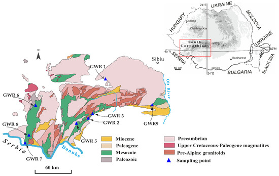 Generalized geological settings of the Southern Carpathians (simplified after Săndulescu et al., 1978 [8]), where the studied springs (GWR1, GWR2, GWR3, GWR5, GWR6, GWR7, GWR8, GWR9) are located.