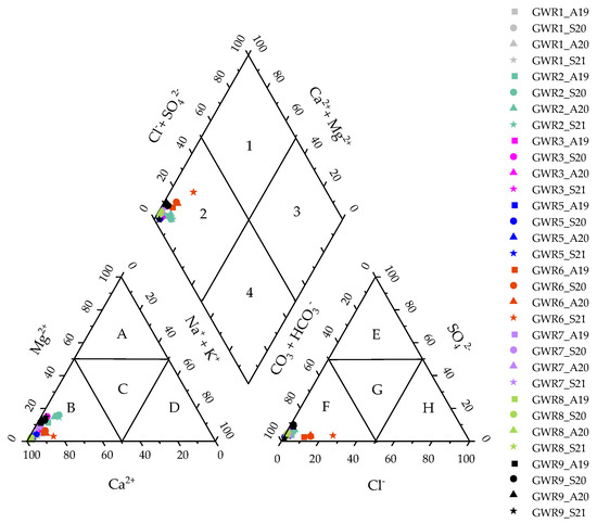 The geochemical facies of the studied spring waters were generated by plotting the concentrations of major cations and anions in the Piper trilinear diagram (Figure 2).