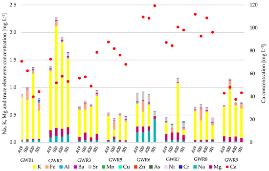 The physico-chemical parameters of the studied spring waters were compared with the guideline values recommended by the World Health Organization [19] for drinking water and the parametric value for water intended for human consumption set by the European Directive 2020/2184 [20] (Table S1). The waters were circumneutral to slightly alkaline, with pH ranging between 7.2 (GWR6) and 8.3 (GWR1) without important variation between the autumn and spring seasons. The total dissolved solids (TDS) ranged between 120 (GWR3) and 470 (GWR6, GWR8), indicating the concentration of inorganic salts dissolved in water. The palatability of the spring waters based on TDS value ranged from excellent (<300 mgL−1) to good (300–600 mg L−1). With some exceptions, the highest TDS values were found in Autumn 2019, without a clear seasonal trend. The TU was generally low, ranging from 0.02 to 5.70 NTU. The highest TU values were measured in GWR1. The main chemical components in the spring waters were HCO3− (134–372 mg L−1) and Ca (37.6–121 mg L−1). The highest HCO3− and Ca concentrations were recorded in GWR6 and the lowest in GWR9, confirming, as expected, that calcium carbonate is the main constituent of the water in karst areas. The concentrations of Na, Mg, and K were much lower than of Ca in all of the springs (Figure 3).