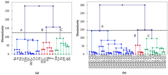 The hierarchical cluster analysis (HCA) using the Ward method and squared Euclidian distance for linkage was used to group the chemical parameters and the spring waters based on their similarities. In Figure 4a, the influence of three distinct sources on the spring water composition were identified. Cluster A (TDS, EC, HCO3−, Ca, Ba, Sr, Na, Ni, Cr, and Cl−) grouped the parameters that result from water–rock interactions. The main sources of Ca in the spring waters are the dissolution of carbonate minerals (calcite, dolomite, aragonite, vaterite), gypsum, and silicates (anorthite, pyroxene), while HCO3− originate from the dissolution of calcite and dolomite [4]. Barium, Sr, and Ni may also originate from the dissolution of carbonate rocks [11]. The dissolution of silicate minerals is enhanced in the presence of Ba in water and further leads to the release of associated trace elements [35]. Sodium results from plagioclases, clays, and feldspars dissolution as well as from cation exchange by clay minerals, while Cl− is derived from rainfall, the dissolution of chloride bearing minerals, and sedimentary rocks [4,36,37]. Cluster B (SO42−, NO3−, Mg, K, and F−) grouped the elements that resulted both from geogenic (weathering and dissolution of minerals) and anthropogenic sources (domestic wastes, sewage systems, irrigation-return-flow, and chemical fertilizers). The natural sources of magnesium are dolomite and magmatic minerals such as biotite, hornblende, and olivine, while the anthropogenic ones are fertilizers (magnesium sulphate, sulphate of potash magnesia, magnesium nitrate) or de-icing and anti-clumping agents [4,36,37]. The main potassium sources are feldspars and clays, but also fertilizer (potassium nitrate, sodium nitrate, potassium sulphate) and domestic effluents [4]. Nitrate and sulfate have most likely anthropogenic origins, resulting from agricultural fertilizers (urea, ammonium sulphate), livestock wastes, and sewage discharges. Sulphate may result also by the dissolution of gypsum, anhydrite, and sulfide minerals. [4,36,37]. Cluster C grouped the pH and elements (Fe, Al, Mn, Cu, Zn) that may be leached at low pH or precipitated at high pH and are probably of anthropogenic origin.