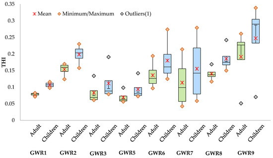 The ADD values were slightly lower for adults (Table S2) than for children (Table S3), both for oral and dermal exposures. The ADD values for the two age groups for oral exposure were higher than for dermal exposure. The ADD values for oral exposure ranged from 3.14 × 10−3 to 3.46 × 102 for adults and from 4.00 × 10−3 to 4.40 × 102 for children, while those for dermal exposure ranged from 1.43 × 10−5 to 1.63 × 10 for adults and from 2.53 × 10−5 to 1.67 × 10 for children. The highest ADD values were obtained for NO3−, for both adults and children and for both oral and dermal exposures. In the case of metals, the highest ADD values were obtained for Fe and the values were 1–2 orders of magnitude lower for the other elements for both types of exposure and age groups. The values of ADDs varied from site to site and between seasons, without a clear variation pattern. HQ (Tables S4 and S5) and HI (Table S6) values were below the unity threshold for both the oral and dermal exposures and for both adults and children, indicating that neither the metals nor the NO3− concentration in the spring waters pose important health risks for the population using these waters. As expected, for each parameter, HQoral was higher than HQdermal. The highest HQoral was found for NO3− (2.16 × 10−1 for adults and 2.75 × 10−1 for children) in GWR9, while the highest HQdermal was found for Cr (1.21 × 10−2 for adults and 4.29 × 10−2 for children) in GWR6. The HQoral and HQdermal were slightly higher for children than for adults, suggesting a higher risk for children than for adults and by ingestion than by dermal exposure. This fact suggests that children are more vulnerable to toxic compounds by ingestion, as they consume more water volume per unit of body weight than adults [38,39]. Qui and Gui [40] also reported that younger people were more susceptible to non-carcinogenic risk than adults in the case of exposure to metals through oral and dermal pathways in Anhui Provence, China. The HIoral was systematically higher than HIdermal for both adults and children. The highest HIoral was found in A19 in GWR9, while the highest HIdermal was in S21 in GWR6 both for adults and children. With some exceptions, the seasonal variation of the HQ and HI were low. Other studies reported groundwater exposure via the oral route as the main factor determining non-carcinogenic risk [41,42]. The THI values varied from 4.26 × 10−2 to 2.61 × 10−1 for adults and from 5.86 × 10−2 to 3.39 × 10−1 for children. The seasonal variation of THI was higher for GWR7 and GWR9 than for the other springs (Figure 5).