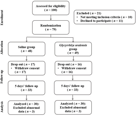Sample size was determined using the G* Power 3.1 program (Heinrich-Heine-University, Düsseldorf, Germany). The number of participants needed for the independent t-test with a significance level a = 0.05 bilateral test, power = 0.8, and effect size = 0.7 was 68. The initial sample size was planned at 96 considering a dropout rate of 40%, and 100 participants were actually included in this study. The dropout rate was set at high since the subjects were college students or working adults. A total of 100 subjects were screened and 79 were randomly assigned to the saline gargle group or Glysyrrhiza uralensis extract gargle group, after excluding 21 subjects who did not meet the inclusion criteria or refused to participate during the five-day study period. A total of 19 additional subjects were excluded from the five-day intervention phase, and data were finally analyzed for 60 subjects (Figure 1).