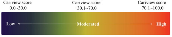 Cariview™ kit (AIOBIO, Seoul, Korea) was used according to the manufacturer’s instructions in order to evaluate the acid production capacity of the dental plaque. The buccal surfaces of subjects #16 and #36 were thoroughly rubbed with a sterile cotton swab, and then immediately put into the culture solution. After culturing for 48 h at 37 °C in an incubator, 10 drops of the indicator in the kit were added, and color change was observed. A score was given based on the image taken using an optical analyzer (Allinone Bio, Seoul, Korea) according to the standards instructed by the manufacturer. The Cariview score means that the closer to 0, the higher the pH value, and the closer to 100, the lower the pH value. According to the criteria, subjects with a Cariview score of 0.0–40.0 are low-risk; 41.0–70.0, medium-risk; and 71.0–100.0, high-risk (Figure 2).