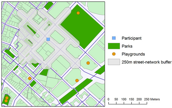 Example of the accessibility to parks and playgrounds in a participant’s neighborhood using a 250 m street-network buffer.