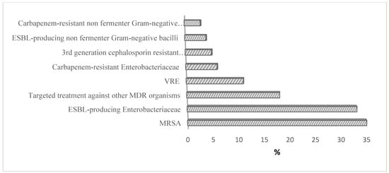 The most common indications and used antimicrobials are reported in Table 3. The most common indication for antibiotics prescription was pneumonia, with 134 prescriptions (17.3%), while the least prevalent indication was both the cardiovascular system and prophylactic gastrointestinal tract infections, representing 25 prescriptions (3.2%). Ceftriaxone was the most commonly used antibiotic, which was prescribed in 116 (15%) of patients, followed by piperacillin, with an enzyme inhibitor in 84 (10.9%) of the prescriptions. At the same time, the least prescribed antibiotic was ciprofloxacin in 25 (3.2%) prescriptions. As for the type of bacteria isolated from cultures, Methicillin-resistant staphylococcus aureus (MRSA) was the most frequently isolated bacterial strain in 35.0% of cultures, while carbapenemase-producing gram-negative bacilli were the least common isolated bacterial strain, which was isolated in less than 5% of the cultures as shown in Figure 1.