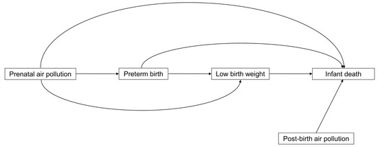 In this study, we revisit the relationship between early life ambient air pollution exposure and infant mortality in the US with regard to particulate matter less than 2.5 μm in diameter (PM2.5). Specifically, we aim to estimate direct pathways from prenatal and post-birth PM2.5 to infant death as well as indirect pathways from the prenatal exposure to the outcome through preterm birth and low birth weight. Investigating the pathways in such a manner not only allows us to compare the relative associations of prenatal versus post-birth exposure but also helps us understand the relative importance of the indirect versus direct pathway in terms of the prenatal PM2.5–infant death relationship. PM2.5 is an important pollutant to study in this context because of its known association with various indicators of fetal health such as fetal growth and organ development as well as its relationship with infant morbidity, especially respiratory diseases [19,20,21].