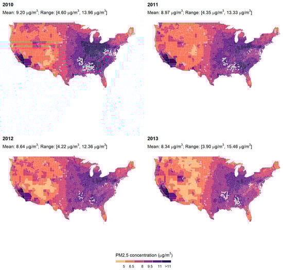 To define our exposure variables, we used modeled estimates of daily, population-weighted mean PM2.5 concentration at the county level within the conterminous US between 2009 and 2014. These publicly available estimates are provided by the Centers for Disease Control and Prevention and are based on the Environmental Protection Agency’s (EPA) Downscaler model [22,23]. The Downscalar model fuses together modeled estimates of air pollution concentration from the EPA’s Community Multi-Scale Air Quality model with data drawn directly from air pollution monitors [23,24].