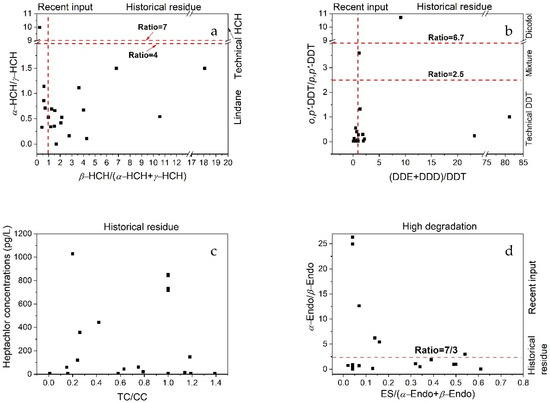 Some other characteristic ratios, such as trans-chlordane/cis-chlordane (TC/CC) and α-endosulfan/β-endosulfan (α-Endo/β-Endo), were also applied to diagnose the sources of chlordane and endosulfan. The ratio of TC/CC in technical chlordane is close to 1.56 [42] since the technical chlordane in the international market contains 13% TC, 11% CC, and 5% heptachlor. The TC degrades faster than CC in the environment. Thus, it is expected that the ratio of TC/CC is less than 1.56 in the natural environment, and it represents the historical residue of technical chlordane; otherwise, it is a recent input or due to other sources. In the Danshui River, the ratios were all less than 1.4 (Figure 3c), indicating the historical residue of technical chlordane, which was similar to the results from the karst spring systems [43] and in the soils [38] near the Three Gorges Dam.