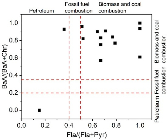 PAHs in the environment mainly come from petrogenic sources and incomplete combustions of petroleum and other fossil fuels, as well as coal and biomass. Incomplete combustions can come from both anthropogenic and natural processes, and the former is gradually becoming the major contributor [45]. The ratios between the characteristic compounds of PAHs can be applied to identify potential source patterns [46]. Two ratios of Fla/(Fla + Pyr) and BaA/(BaA + Chr) were widely applied. Fla/(Fla + Pyr) values <0.4, between 0.4 and 0.5 and >0.5, indicate a petroleum source, fossil fuel combustion, and biomass and coal combustion, respectively [46]. Similarly, if the ratio of BaA/(BaA + Chr) is <0.2, between 0.2 and 0.35 and >0.35, it represents the contribution of petroleum/petrogenic sources, mixed sources and combustion, respectively [46].