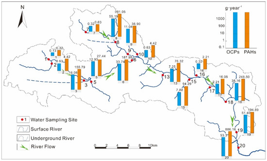 River flow rates at different sections were determined by a hand-held flow tracker. The mass fluxes of OCPs and PAHs were calculated by the measured concentrations and flow rates (Table S2). The mass fluxes of OCPs and PAHs (Figure 5) in the upstream were 131 and 809 g·year−1, respectively; 17.7 and 189 g·year−1 in the middle section, respectively; and 53.3 and 886 g·year−1 in the downstream, respectively. There were much higher mass flows of PAHs than of OCPs, showing the higher emission and heavier burden of PAHs in the Danshui River Basin. Relatively high flow fluxes of OCPs and PAHs in the upstream indicated that the karst groundwater is an important transport intermediary of these pollutants: OCPs and PAHs emitted from agricultural or other human activities in the karst river basin can easily enter the groundwater and are then discharged to the surface water through spring water or to the hyporheic flow in the river, such as in the Danshui River, since these flows are the main sources of the surface water in the upstream of the river in the karst area. This also confirmed the discussion in Section 3.2.1. Potential source analysis of OCPs. Additionally, the adsorption of OCPs and PAHs by particles and the sedimentation of particles could be the main processes to intercept the POPs in the water from the karstic surface system. This is reflected in the proportions of LMW-PAHs and HMW-PAHs from the upstream to the downstream (Figure S2): the proportion of LMW-PAHs was less than 50% in the upstream but was more than 80% in the middle stream and downstream.