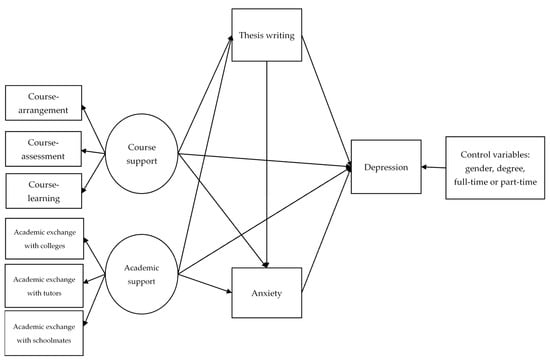 Anxiety has a negative impact on individual mental health, and can lead to depression through a variety of mechanisms [43]. Previous studies showed a significantly positive correlation between anxiety and depression and individuals exposed to anxiety were at a higher risk of depression [44,45,46]. The tripartite model, which was proposed by Clark and Watson, showed that there were overlapping symptoms, such as long-term negative emotion and lack of pleasure, among the patients who have anxiety or depression [47]. Moreover, long-term anxiety may trigger individual depression. For example, anxious individuals are prone to social withdrawal behaviors, which further causes individuals to be rejected by their peers, and eventually brings a sense of loneliness and low self-worth. This cognitive vulnerability is a potential risk and the manifestation of an individual depression [48]. That is, individuals who have or have had anxiety disorders are at greater risk of depression. Therefore, once individual course support and academic support were negatively affected by the pandemic, and individuals were further affected in their thesis writing, causing the individual to experience anxiety and ultimately lead to their depression.
