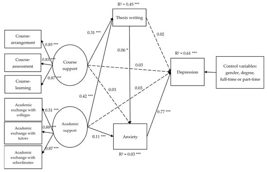 This mediation model consisted of gender, degree (academic master’s degree or professional master’s degree) and mode (full-time or part-time) as control variables [56,57,58], course support and academic support as independent variables, thesis writing and anxiety as mediators, and depression as the dependent variable. Figure 2 presents the result of the path analysis. A good fit of χ2 (38) = 409.58, p < 0.001, RMSEA = 0.056, SRMR = 0.029 and CFI = 0.976 was found for the mediation model.