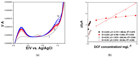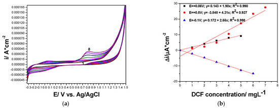 (a) Cyclic voltammograms recorded at CNT paste electrode with the scan rate of 0.050 V·s−1 in 0.100 M Na2SO4 supporting electrolyte (curve 1), and DCF concentrations ranged from 1.00 to 7.00 mg·L−1 (curve 2–8). (b) Calibrations plots of peak current vs. DCF concentrations at the potential value: E = +0.060 V vs. Ag/AgCl (anodic), E = +0.800 V vs. Ag/AgCl (anodic), and E = −0.100 V vs. Ag/AgCl (cathodic).