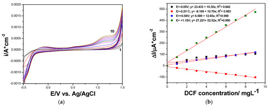 (a) Cyclic voltammograms recorded at GR-CNT paste electrode with the scan rate of 0.050 V·s−1 in 0.100 M Na2SO4 supporting electrolyte (curve 1), and DCF concentrations ranged from 1.00 to 9.00 mg·L−1 (curve 2–10). (b) Calibrations plots of peak current vs. DCF concentrations at the potential value: E = −0.050 V vs. Ag/AgCl (anodic), E = +0.580 V vs. Ag/AgCl (anodic), E = +1.180 V vs. Ag/AgCl (anodic), and E = −0.200 V vs. Ag/AgCl (cathodic).