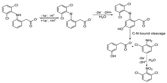 It is clear that the oxidation mechanism is influenced by the DCF concentrations, and considering the DCF oxidation mechanisms proposed in the literature [44,45], we proposed a probable overall complex mechanism of the direct oxidation of DCF on the GR-CNT paste electrode surface. The mechanism considers a complex EE-ECE model and the sorption autocatalytic effect [46], in which the first electrochemical stage (E) is reversible and the other electrochemical and chemical (EC) stages are irreversible (see Figure 4).