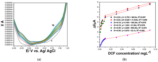 The amperograms recorded by MPA under the above-presented operating conditions are presented in Figure 8a, and the linear dependences of the current vs. DCF concentrations at all applied potentials are shown in Figure 8b. As was expected, a cathodic response was found at −0.400 V vs. Ag/AgCl, while for other potential values, the anodic responses were achieved. It can be easily noticed that the electroanalytical performance related to both the lowest limit of detection (LOD) and the sensitivity were better for multiple-pulsed amperometric technique in comparison with CV results. A further enhancement of the sensitivity and the LOD was achieved by applying the preconcentration step for 25 min prior the multiple-pulsed amperograms recording, when the preconcentration factor of about 26.5 was found (see Table 5).
