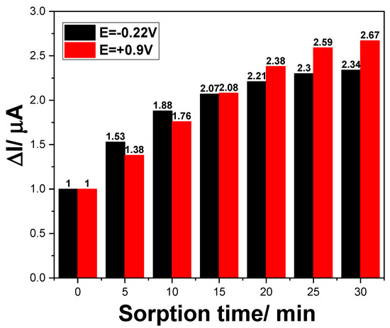 For further improvement of the optimized DPV detection of DCF, considering the sorption property of the CNT and, especially, GR, towards DCF, which should have negatively influenced the higher and medium concentrations of DCF, we considered the development of a preconcentration step-based detection method to achieve DCF detection at trace concentration levels. Different times of maintaining the electrode immersed in 0.500 µg·L−1 DCF and 0.100 M Na2SO4 supporting electrolyte at open circuit potential (OCP) were applied to study the sorption effect on the electrode response. The DPVs recorded after different sorption times in the same 0.500 µg·L−1 DCF are presented in Figure 7, and the preconcentration factor of about 2.50 times was achieved after 25 min, which was selected as optimum sorption time. Applying the sorption time of 25 min made it possible to obtain good voltammetric response for detection of DCF ranging from 10 to 60 ng·L−1 (see Figure S2), and much better sensitivity and LOD (1.40 ng·L−1 for −0.210 V vs. Ag/AgCl and 2.30 ng·L−1 for +0.900 V vs. Ag/AgCl) were reached.