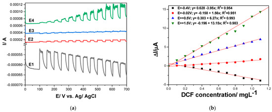 (a) Multiple-pulsed amperograms recorded by GR-CNT electrode in 0.1 M Na2SO4 supporting electrolyte and 0.100 mg·L−1 DCF added consecutively and continuously, recorded at E1 = −0.400 V vs. Ag/AgCl, E2 = −0.020 V vs. Ag/AgCl, E3 = +0.500 V vs. Ag/AgCl, and E4 = +1.50 V vs. Ag/AgCl. (b) Calibration plots of the currents recorded at E = −0.400 V vs. Ag/AgCl, E = −0.020 V vs. Ag/AgCl, E = +0.500 V vs. Ag/AgCl, and E = +1.50 V vs. Ag/AgCl versus diclofenac concentrations.
