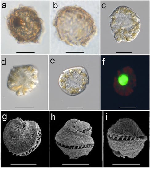 Light microscopic micrographs of the Pseudocochlodinium profundisulcus resting cyst (a), empty cyst (b), and vegetative cells (c–f); scanning electron microscopic micrographs (g–i) of the vegetative cells; Scale bars = 20 μm.