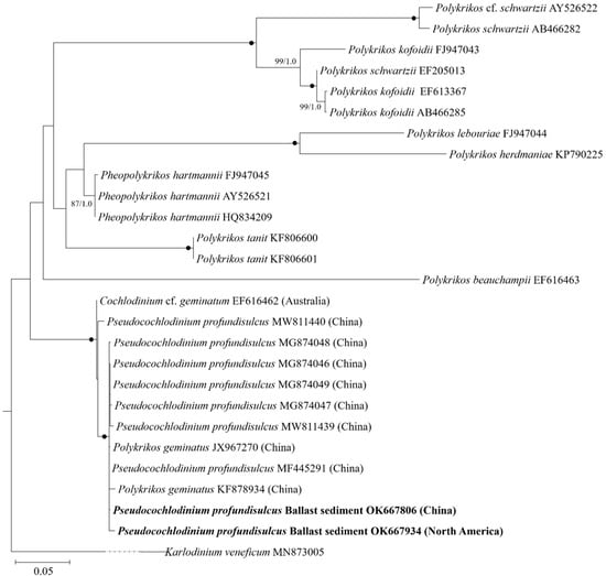 Phylogenetic analyses using maximum likelihood and Bayesian inference generated similar trees but differed at a few internal nodes (Figure 2). The two entities (OK667806 and OK667934) from ballast sediments formed a coherent clade together with P. profundisulcus (MF445291, MW811439, MW811440, MG874046, MG874047, MG874048, and MG874049, from the Pearl River Estuary, China), a previously deposited entity of Po. geminatus (JX967270, KF878934, from the Pearl River Estuary, China; species name provided in GenBank), and Cochlodinium cf. geminatum (EF616462, from Australia; species name provided in GenBank) with strong support (100/1.0).