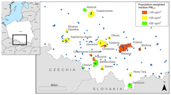 Most of the PM pollution in Poland results from the combustion of coal and other fossil fuels in power and heat generation, and from traffic emissions [30,31]. Estimates of the mortality attributable to PM2.5, based on air quality monitoring data for Poland, have demonstrated that the urban Polish population experiences an unduly high impact from particulate air pollution on their health [32]. Annual deaths attributable to air pollution in Poland were estimated at 39,800 for the year 2000, increasing to 47,300 deaths for the year 2017 [33].