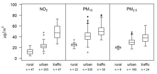 Boxplots illustrating annual means of daily measured NO2, PM10, and PM2.5 air pollutants, grouped by type of station (urban, traffic, rural) from 2007 to 2019, based on monitoring stations in the study area. Between 2007 and 2019, the annual mean values of air pollutant concentrations at the monitoring stations ranged from 4.5 to 73.1 µg/m3 for NO2, from 11.2 to 80.9 µg/m3 for PM10, and from 16.1 to 61.1 µg/m3 for PM2.5.