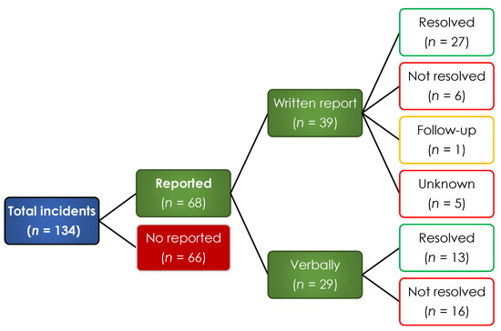 Considering the 68 violent incidents reported to the authorities, 40 of them were attended and resolved, 19 were not attended, 1 incident was still under investigation at the time of the study and for 5 incidents the SSMIs did not know the status (Figure 1). Regarding the 39 written violence reports issued, 23 reports (58.97%) were sent to the heads/managers of the areas to the institution to which each SSMI was affiliated, 10 reports (25.6%) were sent to the University to which each SSMI was affiliated, and two reports (5.12%) were sent to the municipal police. Of all reported incidents, both the Autonomous University of Zacatecas and the Autonomous University of Durango Campus Zacatecas attended 80% of the reports received, the Zacatecas Ministry of Health attended 70% of the reports received and heads/managers of the medical units attended 65.2% of the reports received.