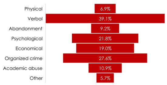A total of 119 (75.8%) of the SSMI who participated in the study stated that they were victims of some type of aggression and described a total of 134 incidents of violence, only 68 of these incidents were officially reported (Figure 1 and Figure 2). The top 5 types of violence experienced by SSMIs were verbal violence (39.1%), violence from organized crime (27.6%), psychological violence (21.8%), economic (19%) and academic abuse (10.9%) (see Figure 2). At the time of the assault, only 53 (33.6%) of the SSMIs issued an official report to the authorities, resulting in a total of 68 reports and only 39 (59.1%) of them were written reports (Figure 1).