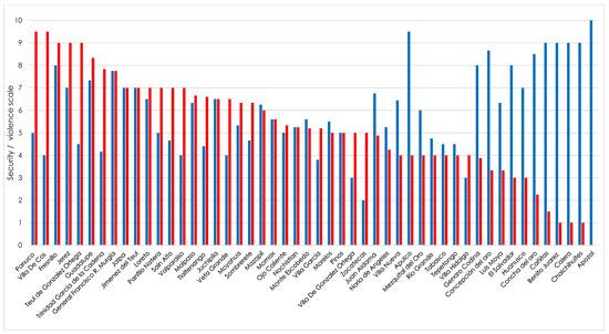 Levels of security and violence perceived by SSMIs in the state of Zacatecas in the 2020–2021 class on the medical units where they did their social service work. Plot was constructed without distinguishing by sex the study population. Security level: blue bars. Violence level: red bars.