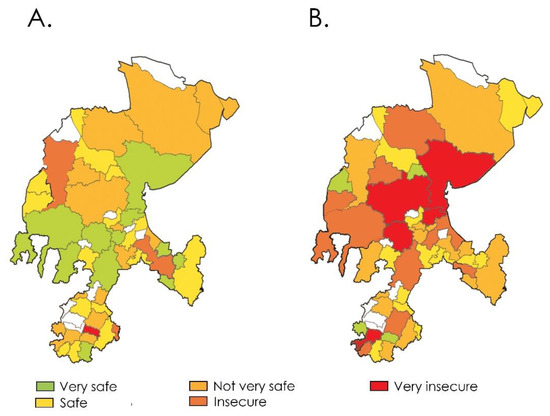 Level of security perceived by SSMIs in medical units and municipalities of the state of Zacatecas. The Figure shows a colorimetric representation of the municipalities according to the perception of safety that the SSMIs had on the medical units (A) and on the municipalities where these units were located (B). See the guide map (Supplementary Figure S1) for the identification of the municipalities.