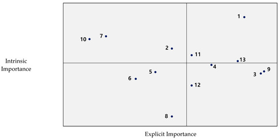The results of the matrix from the modified IPA analysis are shown in Table 2 and Figure 1. Explicit importance, as shown on the X-axis, was shown as having a minimum value of 3.8 and a maximum value of 4.5 based on the mean value of 4.2. The intrinsic importance of the Y-axis was shown as a minimum value of −0.4 and a maximum value of 0.5 based on the mean value of 0.06. The total number and quadrant of each variable are as shown in Figure 1. First, “quality of dance performance”, “platform for OTT streaming” and “promotion for potential audience development” were presented in quadrant 1 as representing important execution elements. These factors are of both high explicit and intrinsic importance and are important enforcement factors that must be met to positively affect the viewing satisfaction with online dance content. Second, “brand awareness of choreographer or dance company”, “services for online audiences” and “fee and price criteria” were presented in quadrant 2, indicating they are attractive elements. These factors are of low explicit importance but high intrinsic importance, and these factors are attractive attributes that affect the viewing satisfaction with online dance content, although consumers do not expect much. Third, “new formats and curation”, “convergence technology for field sense” and “Services for online audiences” were included in quadrant 3 representing the unimportant elements of execution. This is both low in explicit importance and inherent importance, and if these factors are met, they may have a positive effect on viewing satisfaction with online dance content, but if not, they do not have a significant negative impact. Fourth, “production and editing competency”, “quality of videos and sounds”, “copyright of performance creation” and “fandom and audience management” were included in the quadrant representing essential elements. These factors are of high explicit importance and low intrinsic importance, meaning that if these factors are not met, this can have a significant negative impact on satisfaction, which is an essential attribute in the distribution strategy of online dance content.