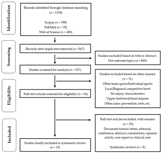 According to the criteria for conducting systematic reviews, ‘Preferred Reporting Items for Systematic Reviews and Meta-Analysis’—PRISMA [26], the study was carried out during May and September 2021 and was composed of four stages (Figure 1): (1) Identification: the first (I.M.G.) and sixth author (A.d.l.R.) found 1,158 studies in the three databases analyzed (Scopus, PubMed, and Web of Science); (2) Screening: duplicate studies (n = 191) and those considered non-relevant based on an initial reading of the title, abstract and keywords (n = 860) were eliminated by the second (A.M.) and third author (J.L.C.). Furthermore, these same authors rejected 51 scientific papers for ‘other reasons’ (see Figure 1). At the end of this phase, there were 56 remaining studies. (3) Eligibility: the fourth (D.M.) and fifth author (M.M.) eliminated those studies that did not have an original article published in a peer-review scientific journal (n = 29) and also systematic reviews or meta-analyses (n = 8); (4) Inclusion: a total of 19 studies were considered suitable for analysing and synthesizing their research.