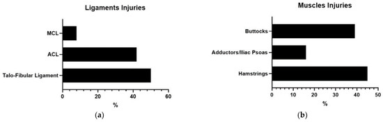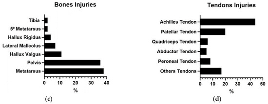 The most commonly damaged tissues, depending on the body area injured, were (Figure 2a–d): (1) Ligaments. The ligaments with the highest incidence were the talofibular ligaments of the ankle (50.00%) and the ACL (42.00%); (2) Muscles. The most common injuries occurred in the upper posterior part of the lower limb, that is, the hamstrings (45.00%) and the buttocks (39%); (3) Bones. The most affected bones were, in this order, the metatarsal bones of the foot (38.00%) and the pelvis (36.00%); (4) Tendons. The highest number of pathologies were in the Achilles tendon (44.00%).
