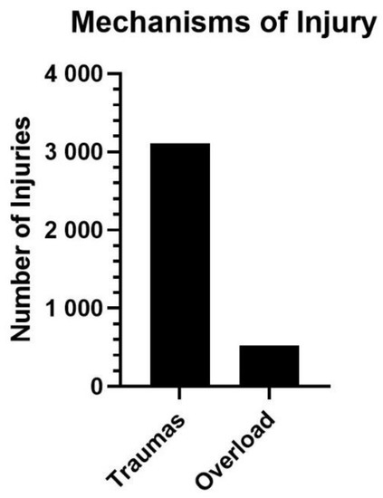 Associated with the mechanism of injury production (Figure 3), there were 3105 injuries caused by trauma or sudden impacts (85.61%), while only 522 (14.39%) were caused by overload or overuse of the structure or tissue. A high percentage of trauma injuries (68.72%) were identified in men’s national competitions. In women, the cause of the injury was only reported in 60 of the cases registered and analysed.