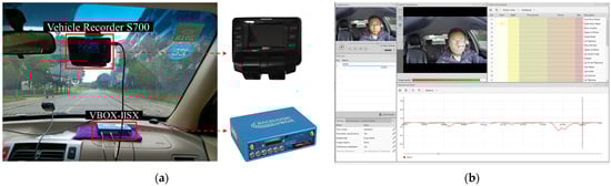 In this test, the vehicle kinematic data were collected by VBOX-IISX GPS data loggers with a sampling frequency of 10 Hz. The outside ambient video and driver video information were collected by the S700 Vehicle Recorder, while the driver expression data were obtained through the processing of the driver videos with the FaceReader 8.0, a tool that automatically analyses facial expressions and provides an objective assessment of a driver’s motion. The test equipment is shown in