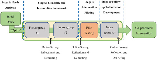 In line with recommendations from the Medical Research Council [49,50], a phased approach to the development of complex interventions was implemented between June 2020 and March 2021. This participatory process started with a needs analysis (online survey), followed by a co-production development phase. The development phase included three online participatory focus group meetings, including regular debriefing sessions with the research team between each meeting, before the co-produced intervention was subsequently piloted (Figure 1). The piloting phase ensured that the intervention was refined sufficiently before the delivery of a future large-scale effectiveness trial. Supplementary Table S1 depicts the objectives and key tasks of each participatory stage.
