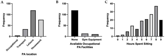 A view of (A) physical activity behaviours of office-based workers, (B) the current organisation workplace physical activity provision, and (C) the average time spent sitting down at work based on self-reported data (n = 157).