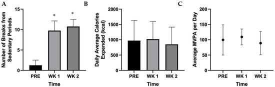 Overall, the number of breaks from being sedentary significantly increased from 2 prior to the intervention, to 10 (p = 0.01) and 11 (p = 0.04) in weeks one and two, respectively (Figure 3A). Moreover, compared with prior to the intervention, there were no changes in daily average calories expended (kcal; Figure 3B; p = 0.642) or average daily moderate–vigorous physical activity (Figure 3C; p = 0.583). Across the three weeks, average MVPA per day fluctuated from 100 min in week one to 109 and 89 min in weeks two and three, respectively.