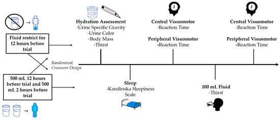 Hydration is a critical component of nutrition and a myriad of evidence has supported that low fluid intake, or hypohydration, results in negative performance and health outcomes [1,2,3]. Although recent research has pointed to the impact of hypohydration on several domains of cognition, the impacts of mild hypohydration through relatively short bouts of fluid restriction have demonstrated mixed results [4]. One of the domains of cognitive performance is visuomotor reaction time. Visuomotor reactive ability is important for the general population for activities such as driving, as well as for athletes aiming for peak performance. Although the extent has not been fully realized in the general population, previous evidence has shown that high plasma tonicity and mild hypohydration are highly prevalent in older adults [5,6]. Thus, prevalence of mild hypohydration and the importance of reaction time in the general public and athletic populations indicates a need to further inquire as to how mild hypohydration impacts visuomotor reaction time.