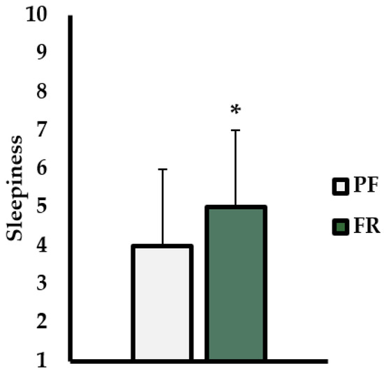 Sleep alertness values (Karolinska sleep scale). 1—Extremely alert; 2—Very alert; 3—Alert; 4—Rather alert; 5—Neither alert nor sleepy; 6—Some signs of sleepiness; 7—Sleepy, but no effort to keep awake; 8—Sleepy, but some effort to keep awake; 9—Very sleepy, great effort to keep awake, fighting sleep; 10—Extremely sleepy, can’t keep awake. Data are presented as mean ± standard deviation. * indicates statistically significant differences between trials.
