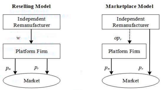 In this study, we consider a platform firm that operates a retailing platform and sells new products to consumers via the platform. Then, we examine an IR that undertakes remanufacturing and sells remanufactured products to consumers via the retailing platform. The two types of marketing models are provided by the platform firm. Under reselling model with which the IR sells remanufactured products to the platform firm at a wholesale price w; then, the platform firm resells these products at (if remanufactured) or (if new) to consumers via its platform. While under marketplace model the IR can sell remanufactured products at to consumers through the platform directly. However, a commission fee needs to be paid by the IR. The commission rate is α, α ranges from 0 to 1, and the corresponding commission fee is α. The structures of these two marketing models are presented in Figure 1. We use and to denote the production costs for each new product and each remanufactured product, respectively. In addition, and satisfy >≥ 0. To focus on the insightful cases in which the IR has incentives to undertake remanufacturing operations and the sale of remanufactured products is positive, we normalize to 0. The sequence of events is as follows. Firstly, the platform firm decides which marketing model should be applied to the IR. Under reselling model, the IR determines whether to accept the model and once accept decide the wholesale price further, and finally the platform firm decides the quantities of new and remanufactured products. Otherwise, that is, under the marketplace model, the platform firm decides the quantity of the new product, and the IR simultaneously determines the quantity of the remanufactured product. Here, we consider a Nash game between the platform firm and the IR under the marketplace model. We will further explore a Stackelberg game where the platform firm acts as leader followed by the IR when the IR adopts the marketplace model.